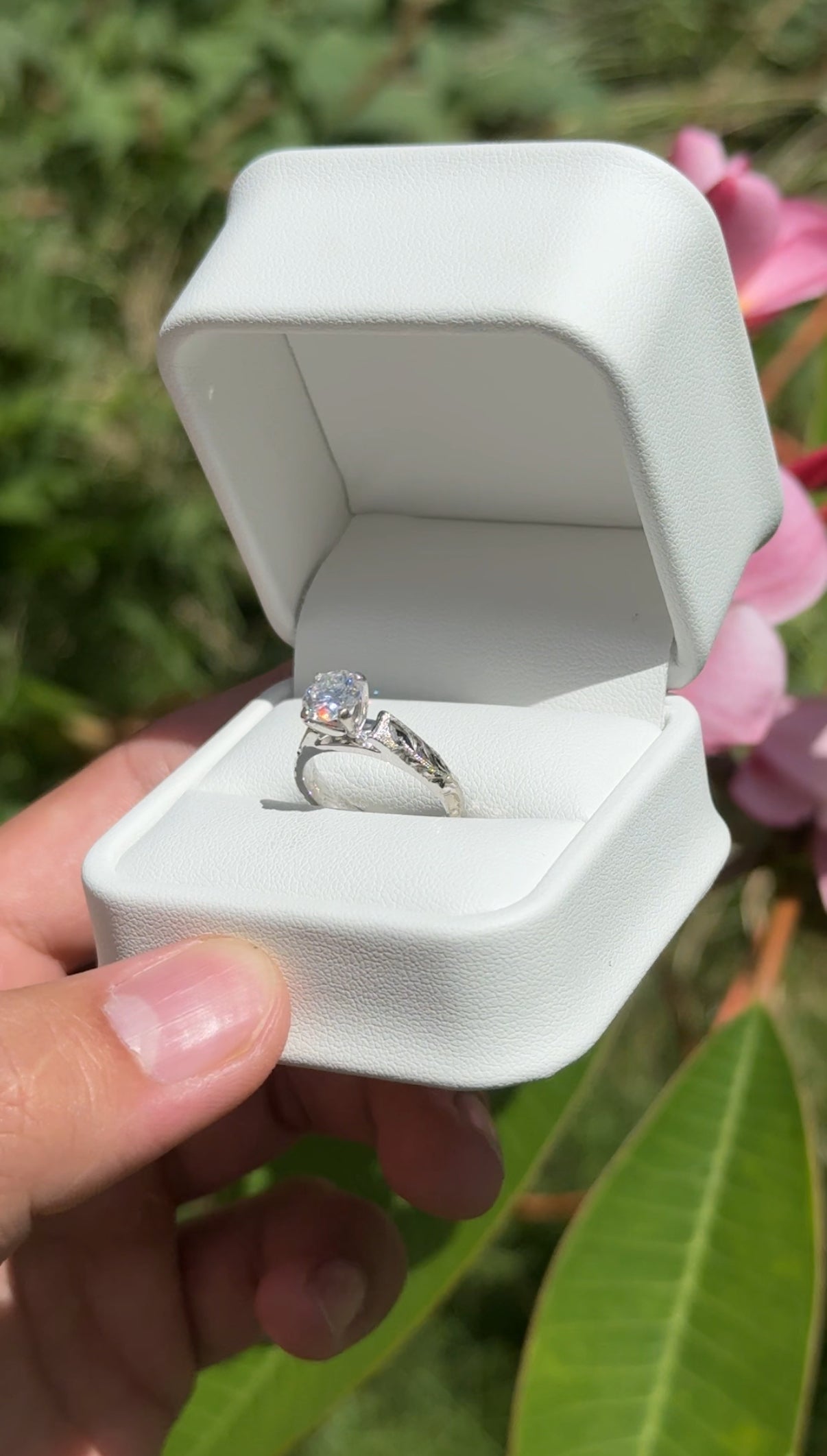 A classic Cathedral-style engagement ring with hand-engraved Maile leaf design on a 4mm 10k gold band, featuring a 1ct round lab-grown diamond (6.5mm). A meaningful symbol of love, heritage, and commitment.